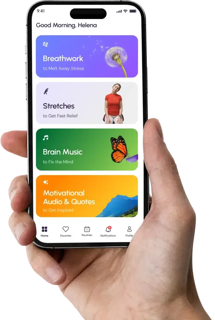 Guided breathwork, calming nature imagery, desk stretches, focus music, and motivational audio, all designed for people managing stress and anxiety at work.